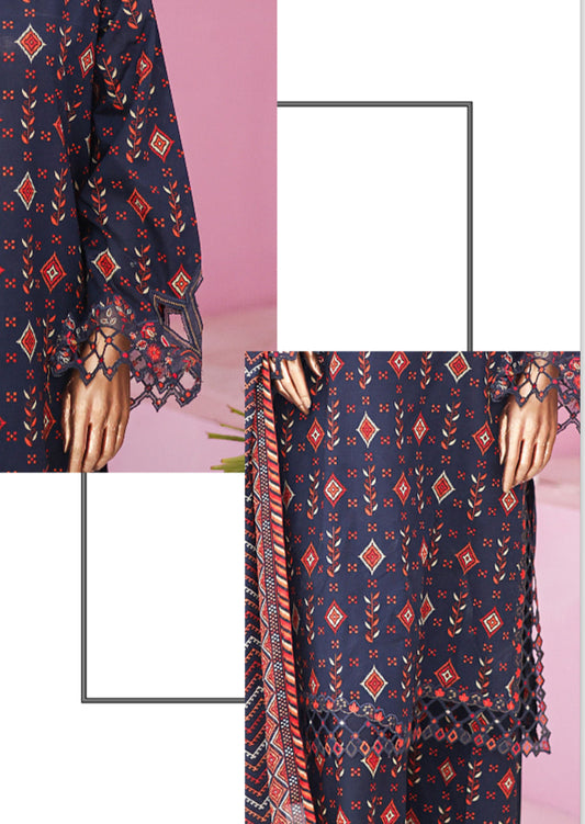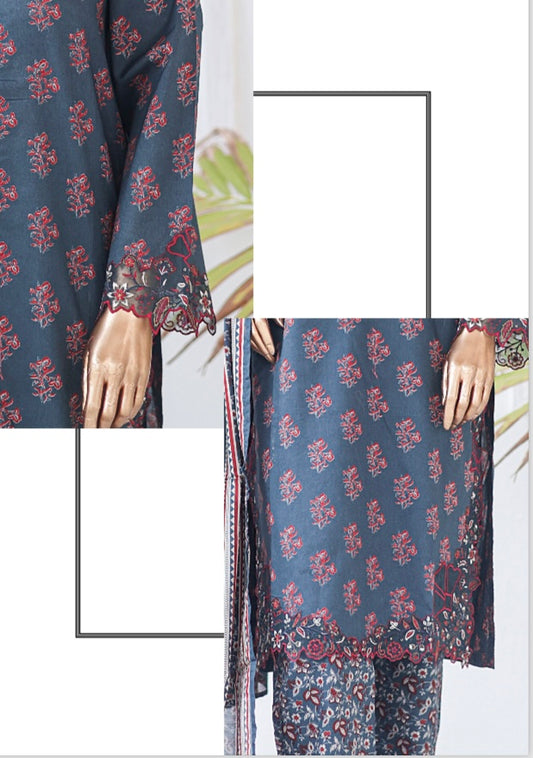 Summer Cutwork Embroidery 3 Piece - BLUE/RED